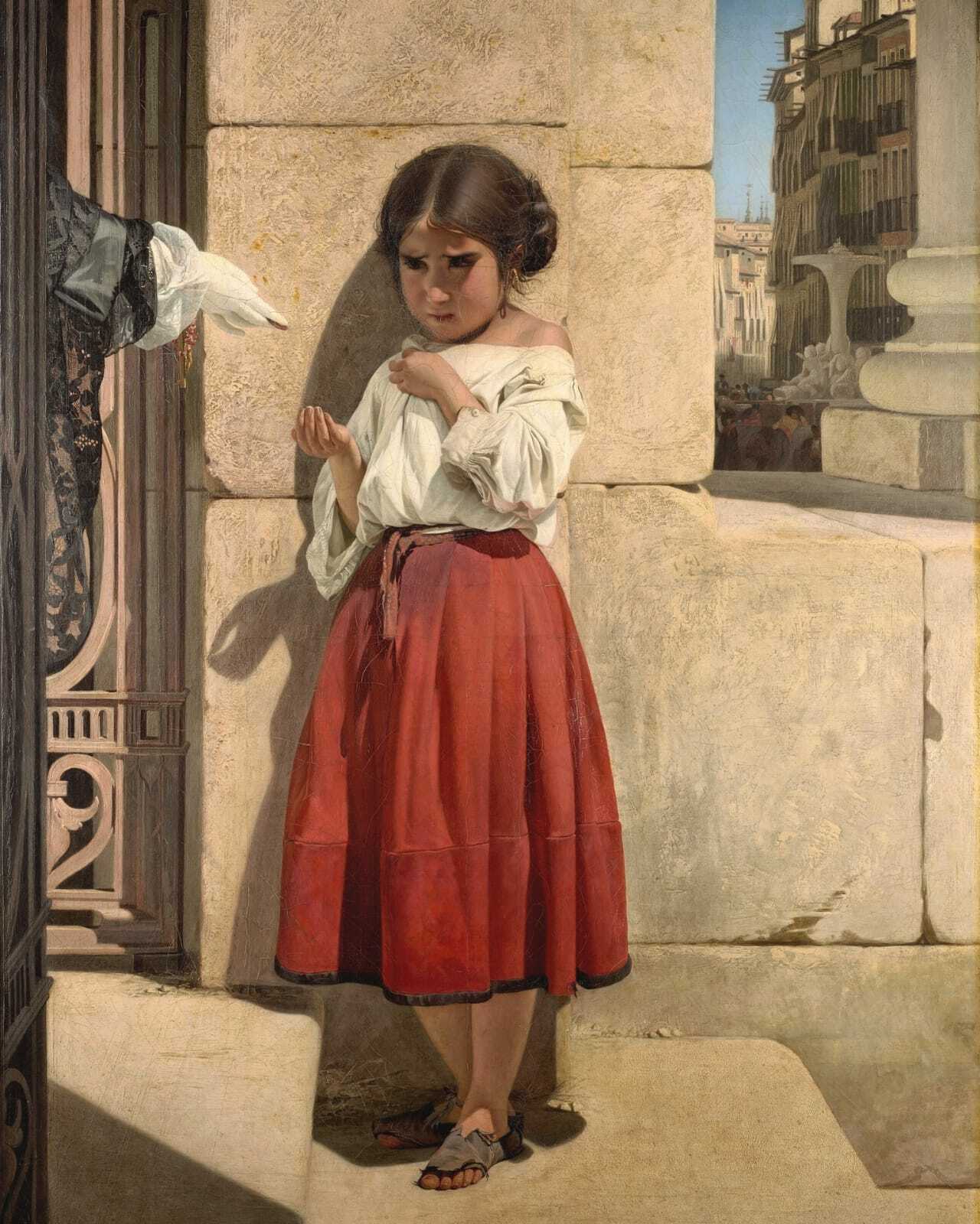 В глазах девочки можно увидеть неподдельную боль и муку. Брови нахмурены, взгляд сосредоточен на монете, которую протягивает из двери изящная рука в белым тонких перчатках.